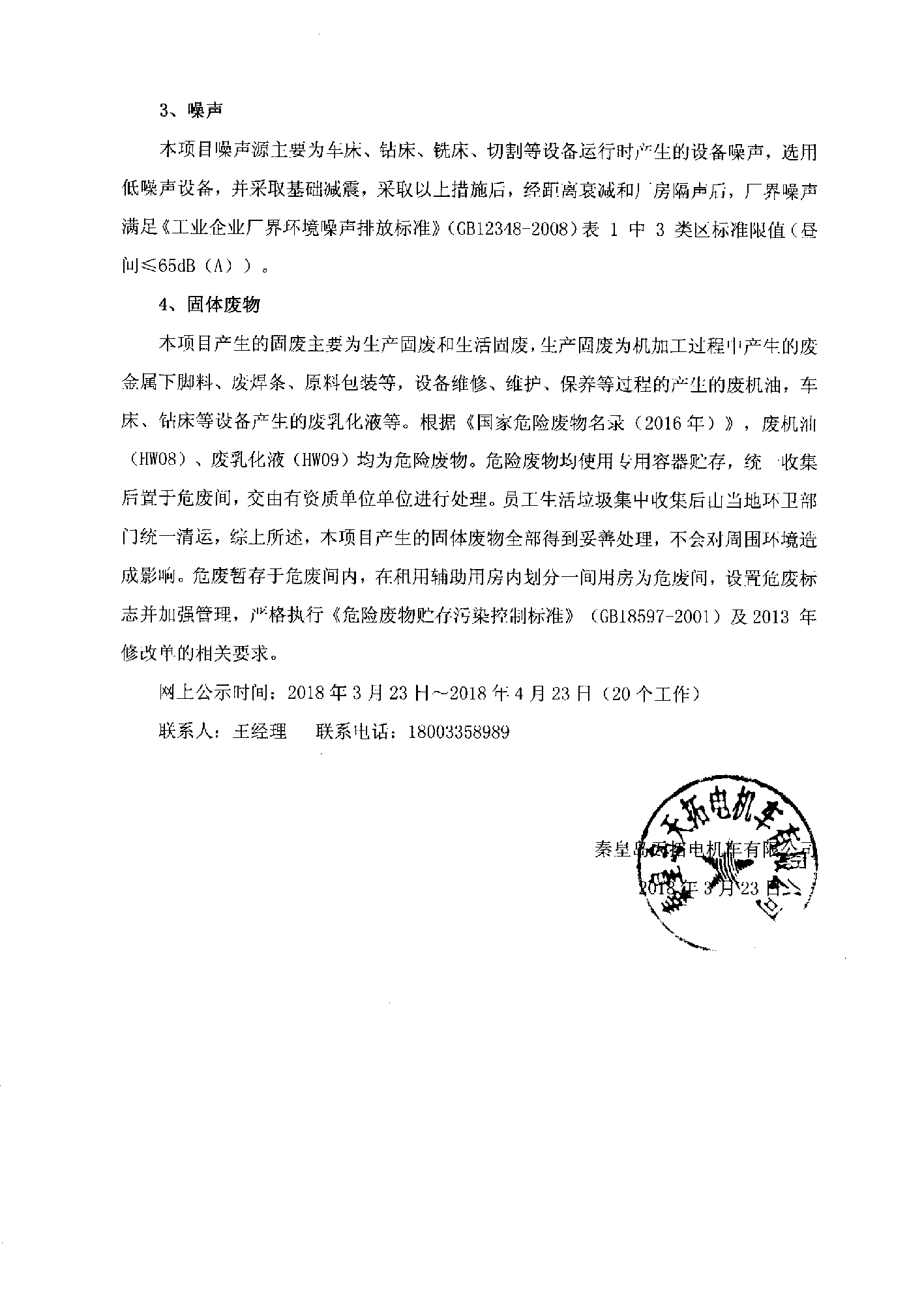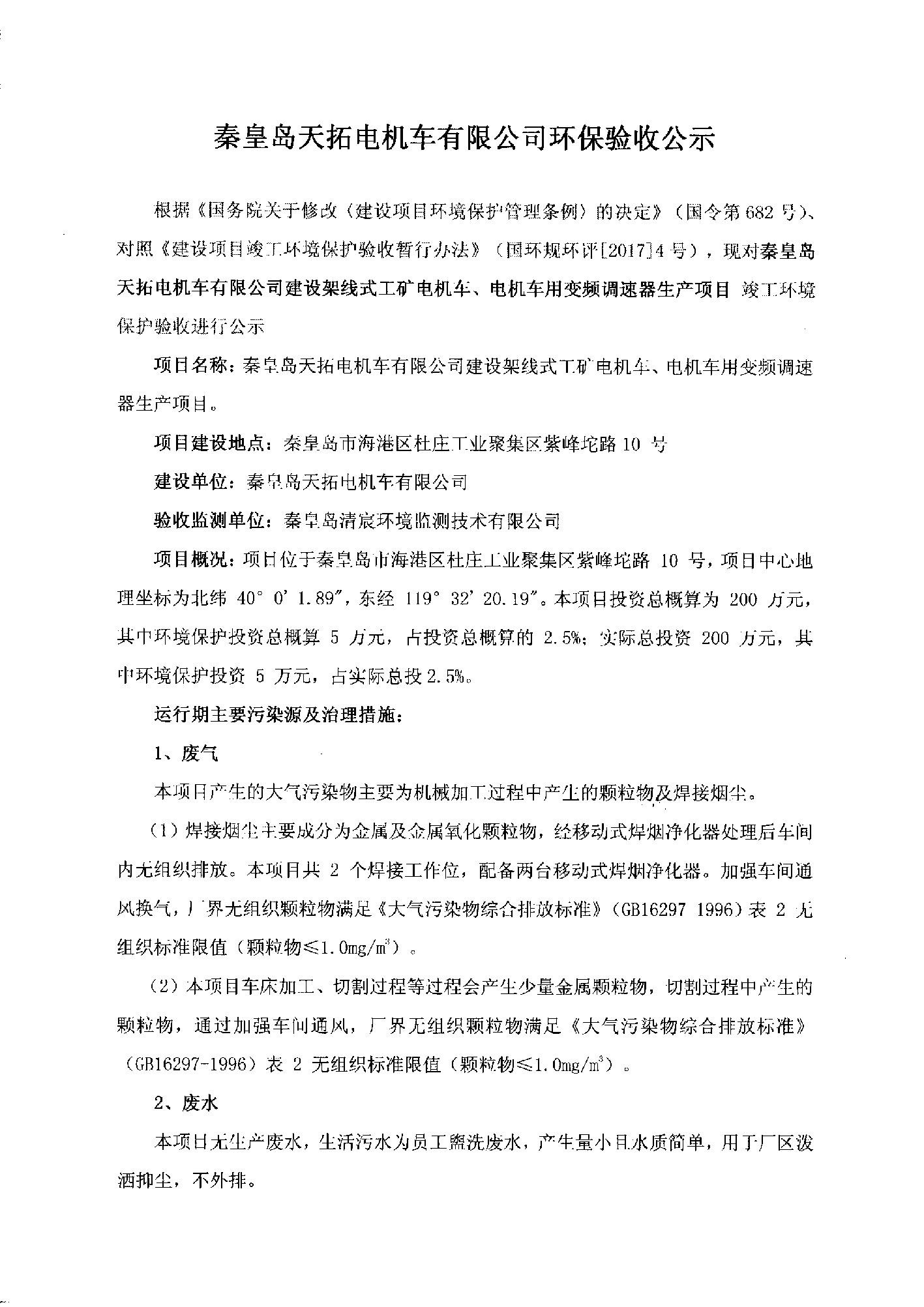 秦皇島天拓電機車有限公司環(huán)保驗收公示